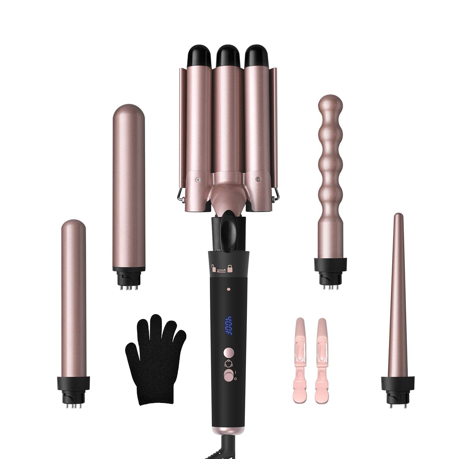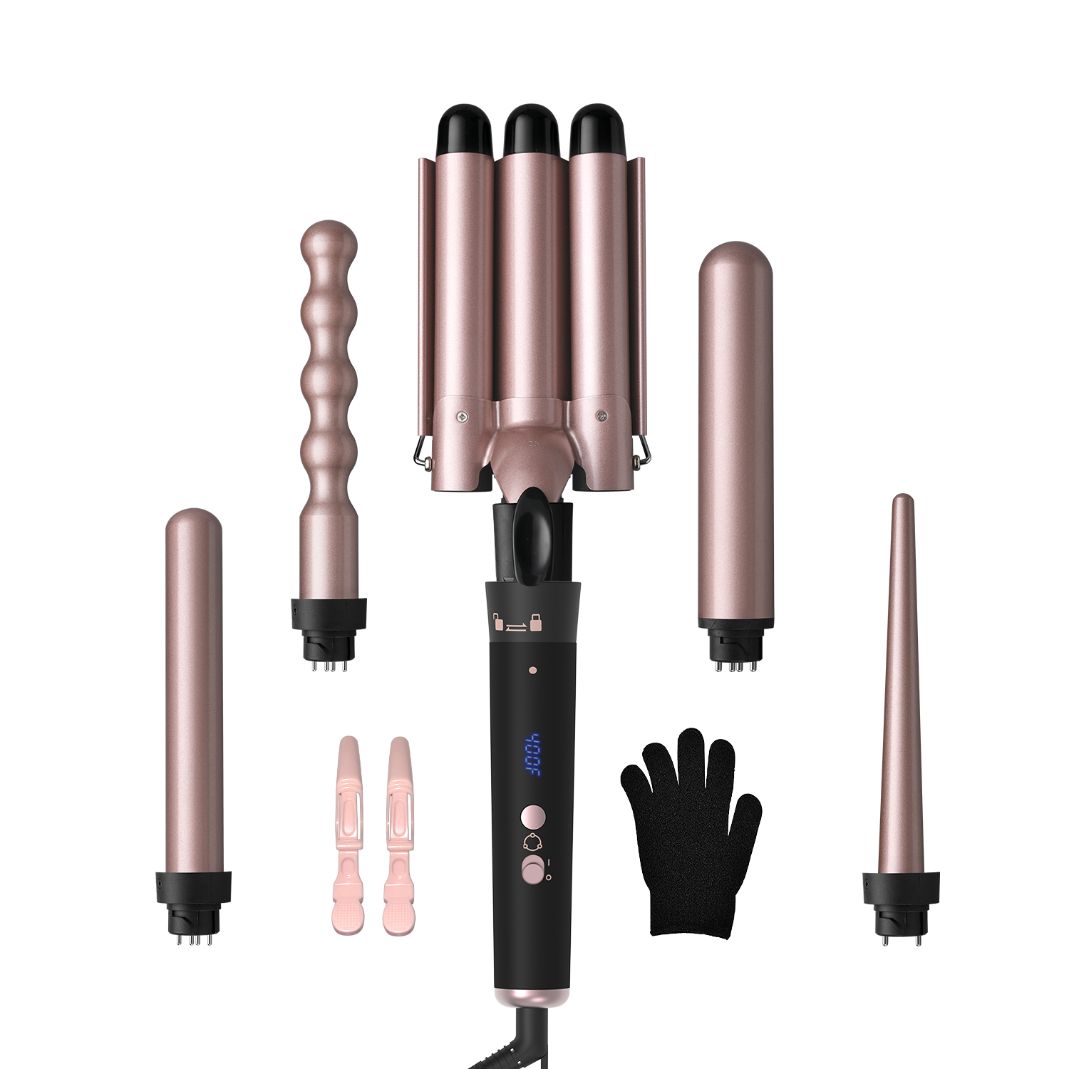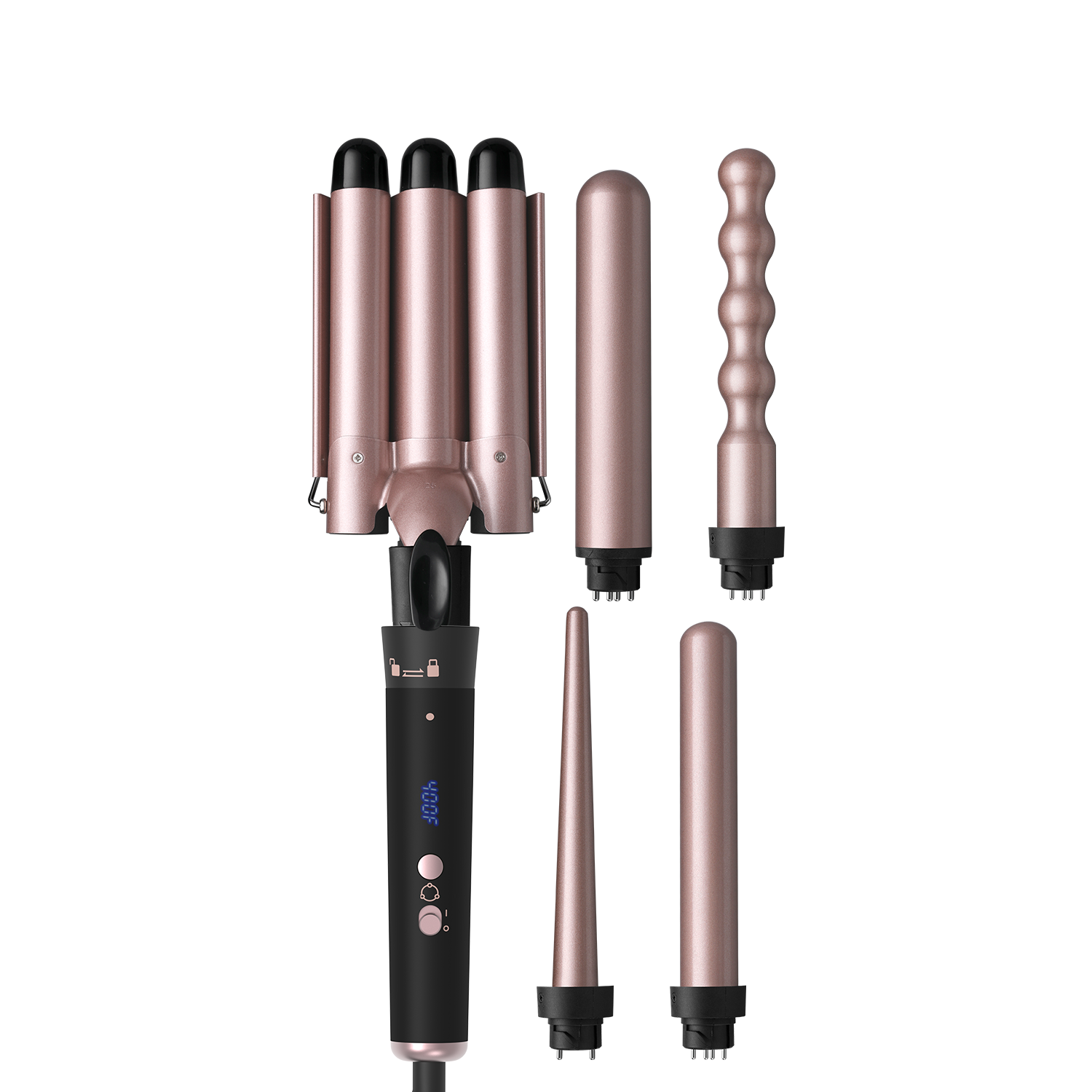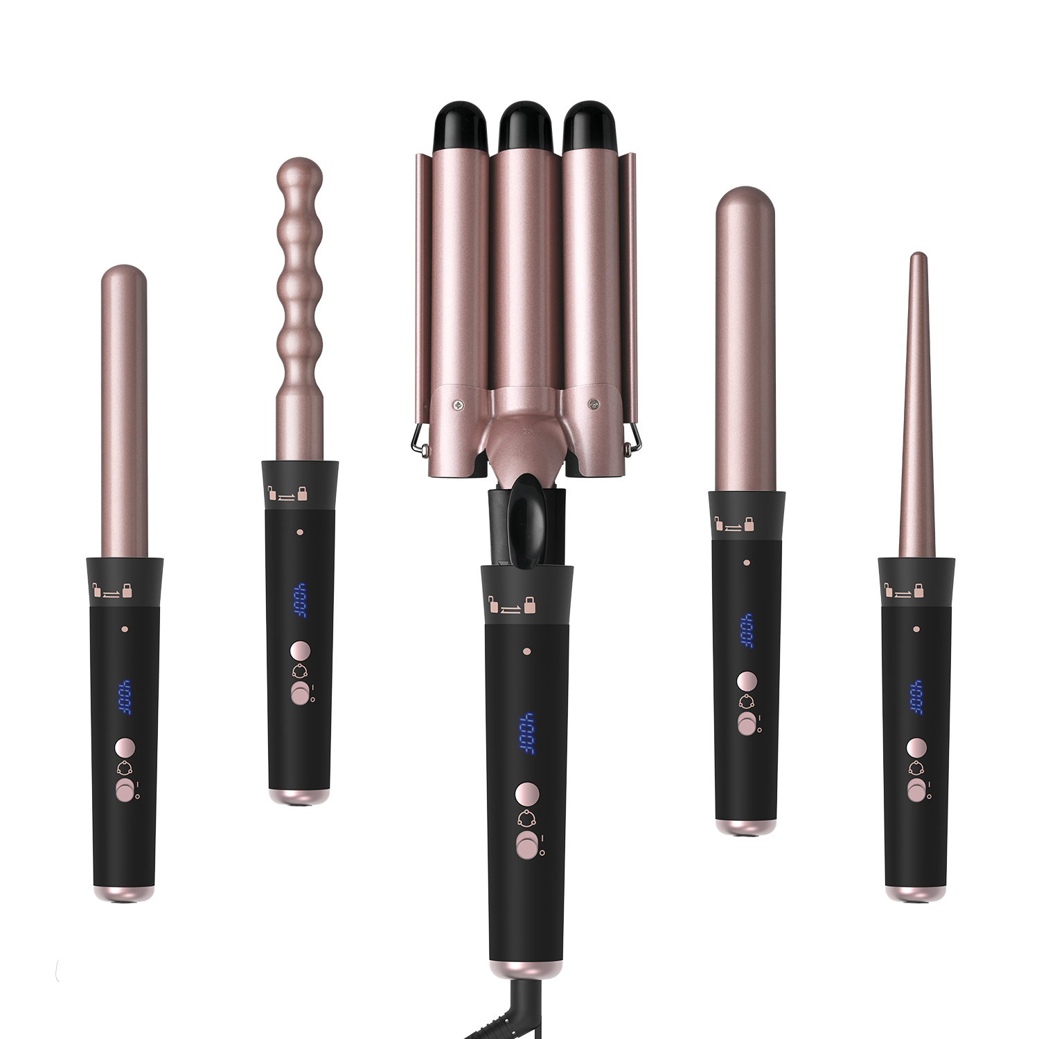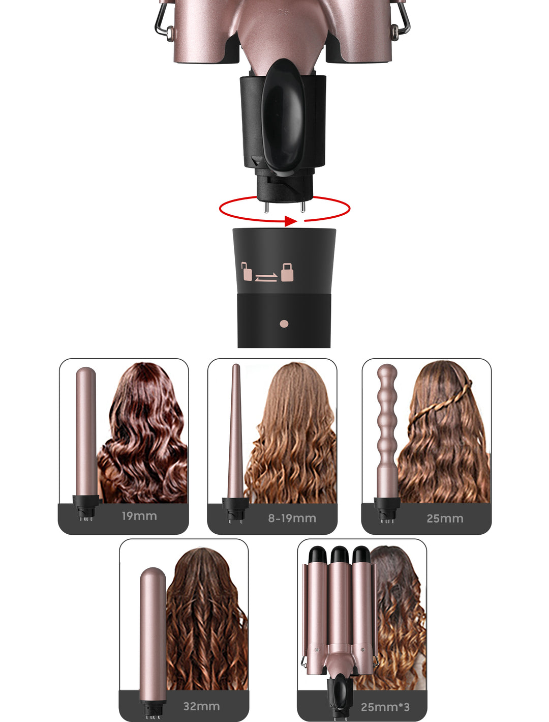 - Set de Fer à Friser 5 en 1: 09-18 mm / perle 25 mm / 13-25 mm / 32 mm / 25 mm fer à friser 3 fûts. Livré également avec deux épingles à cheveux, des gants de protection, un mode d'emploi en français