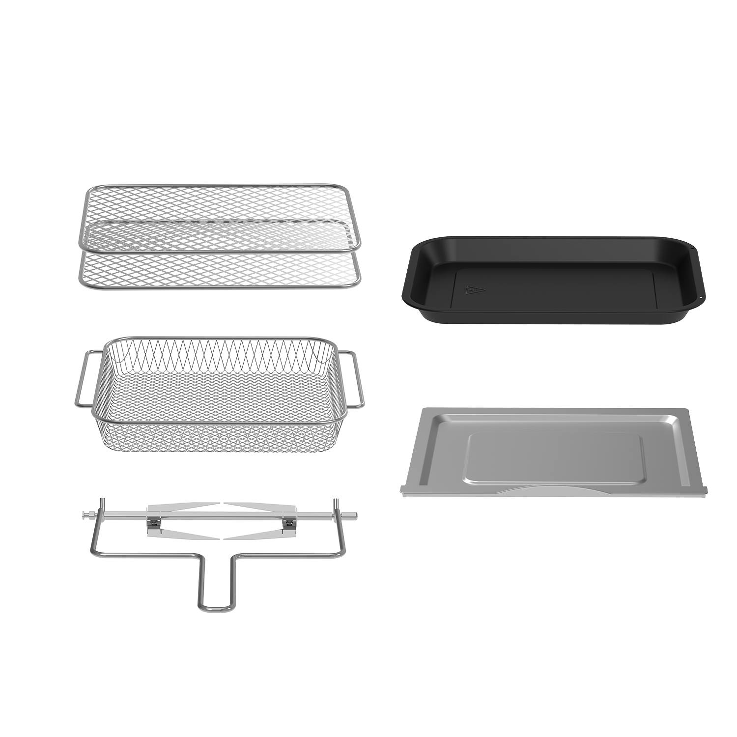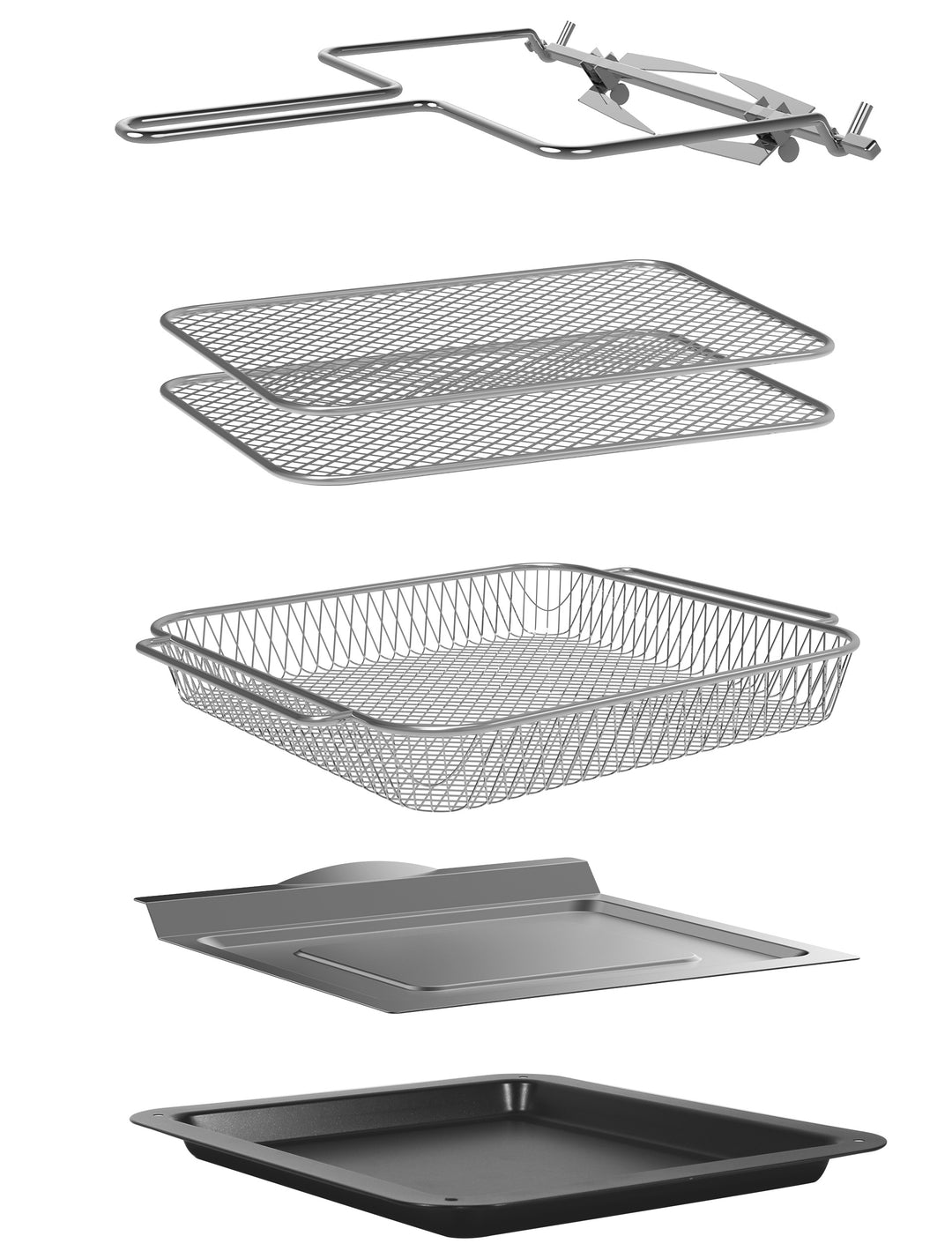 Le four à friteuse à air est livré avec les accessoires. Tous les accessoires sont antiadhésifs et vont au lave-vaisselle, ce qui rend le nettoyage rapide et facile.